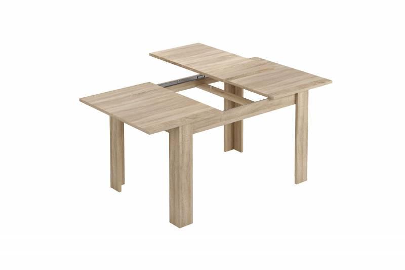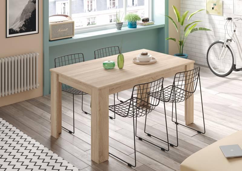 Mesa comedor extensible madera color roble, de medidas de 140 de largo x 90 de ancho, la mesa abierta mide 190 y la altura de 78 cm. Guías correderas metálicas.