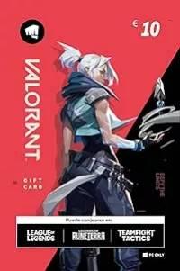 ¡Personaliza tu experiencia de VALORANT según tu propio estilo! Desbloquea diseños de arma: Cuando acabas con todo el equipo rival, que te vean hacerlo con estilo. Los diseños de arma están creados para ser solo cosméticos y no proporcionan ventajas ni desventajas a la experiencia de juego. Desbloquea nuevos agentes: Encuentra tu estilo de juego con uno de los 11 agentes disponibles en VALORANT, que podrás desbloquear completando contratos en el juego o adquiriéndolos con puntos de VALORANT. T?‰RMINOS Y CONDICIONES Esta tarjeta de moneda virtual (MV) de Riot Games (RG) (esta Tarjeta) te permite comprar MV por valor del importe impreso en la parte frontal de esta Tarjeta para su uso exclusivo en las tiendas online de Riot Games y los clientes de Riot Games indicados en prepaidcards.riotgames.com. La MV te permite adquirir el uso de objetos virtuales prémium para tu cuenta de RG. Tu PC debe cumplir determinados requisitos mínimos para jugar a cualquier juego de RG. Esta Tarjeta no puede canjearse por dinero en efectivo o equivalentes (excepto cuando la ley lo requiera), no tiene valor de rescate ni se puede devolver. A menos que la ley lo requiera, el valor de esta Tarjeta no será reemplazado si se pierde, roba, destruye o utiliza sin permiso. Guarda el recibo de compra original. No se transferirá ningún saldo no utilizado. Al canjear esta Tarjeta, se te solicitará que aceptes los Términos de servicio y la Política de privacidad disponibles en www.riotgames.com y que rigen el uso que se haga de esta Tarjeta y RG. Se deducirá el valor total de esta Tarjeta cuando canjees el código. No rasques la Tarjeta para descubrir el código hasta que se te solicite en línea y no la compres si ya se ha rascado. Todos los fondos asociados a esta Tarjeta son de titularidad exclusiva de Riot Games Ltd u otras partes que actúan en su nombre. Ni Riot Games Ltd ni sus afiliados ofrecen ninguna garantía, expresa o implícita, en relación con esta Tarjeta ni con ningún aspecto de los juegos mencionados en prepaidcards.riotgames.com, y rechazan cualquier tipo de responsabilidad explícita o implícita en la medida en que la ley lo permita. El único recurso de que dispones es el reemplazo de esta Tarjeta. Algunas jurisdicciones no permiten determinadas renuncias y estas limitaciones podrían no ser aplicables a tu caso. Riot Games, Ltd. puede modificar estos términos ocasionalmente sin previo aviso. Mínimo :SO: Windows 10