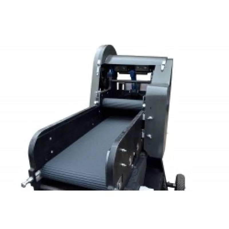 La máquina está dotada de dos bandas de 300 mm de anchura que, de modo fiable, prensan el material introducido. La banda transportadora está instalada a lo largo de toda la máquina, por tanto, no es necesario empujar el material manualmente. Para accionar las bandas sirven ruedas dentadas de alta calidad (por la falta de la cadena se mantiene la fuerza constante de presión).