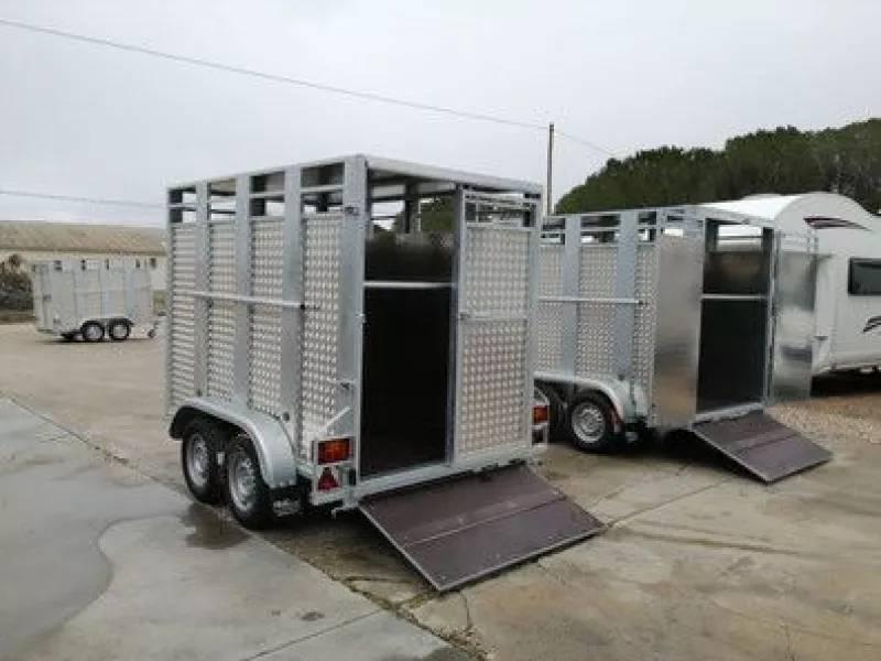 Vea todos nuestros modelos en RMCREMOLQUES. COM Remolque ganadero cuadrado galvanizado por inmersión y carrozado en aluminio, con componentes mecánicos de 1° calidad KNOTT. Trasera con puerta corredera y abatible o con puerta en dos hojas y cierres falleba. Ejes de 1000 kg, cabezal y freno de 2000 kg, freno de inercia a las 4 ruedas, freno de mano, rueda de repuesto, rueda jockey reforzada y autoretractil, puerta delantera lateral, pecheras delanteras y traseras, Para 750 kg ò para matrícula roja. Hacemos envíos a toda España!!! Consulte sin compromiso!!!