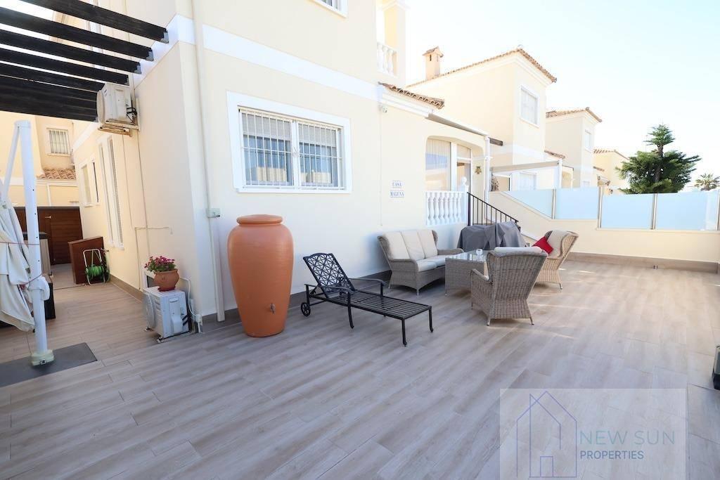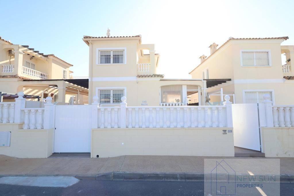 Chalet 4 dormitorios, 2 baños, 0 garajes, Buen estado, en Orihuela Costa, Alicante Lomas de Cabo Roig, Residencial Villas Santa Ines, Chalet independiente orientación Sur con una parcela de 130 m2 y una vivienda en dos alturas más sotano de 135 m2, la vivienda dispone de 4 dormitorios ( los dos de la planta de arriba cada uno con su terraza independiete), 2 baños, aseo, amplio salón comedor, cocina grande independiente con galeria cerrada, y una gran terraza, tiene entrada para un coche pequeño y espacio para construir su propia piscina, la vivienda se vende amueblada y con aire acondicionado, el residencial cuenta con una piscina comunitaria.